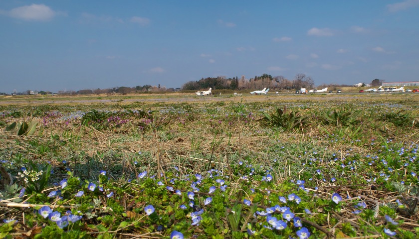 飛行場の草は丹念に刈られているので、背の低い草ばかり。その結果、普通は目立つことのないオオイヌノフグリが(花の大きさが5mmぐらい)