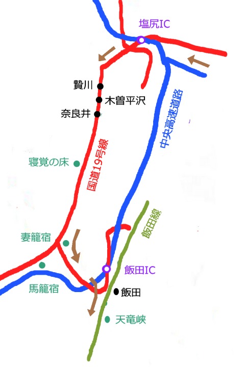 中央高速を塩尻で降り、そのまま国道19号線を南下します。国道に沿って中山道の宿場町が点々と続きます。