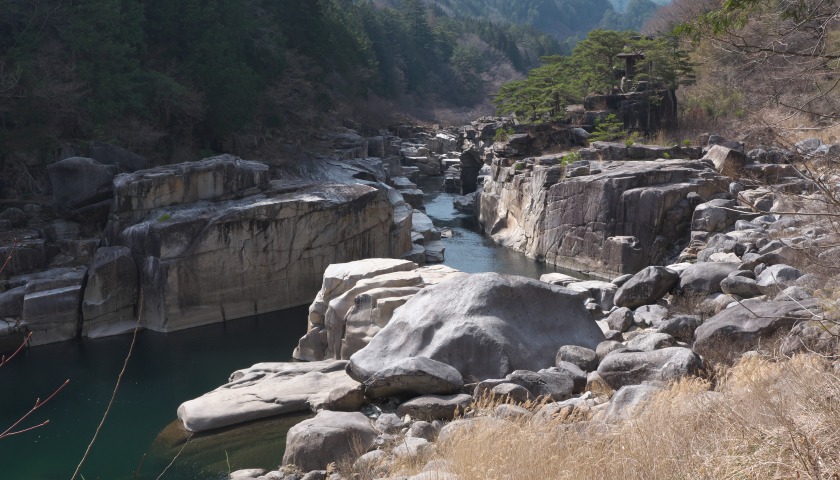 木曽川の浸食でつくられた奇岩が並んでいます。ここは寝覚めの床と呼ばれる場所で、浦島太郎がここで寝覚め、玉手箱を開けてしまった