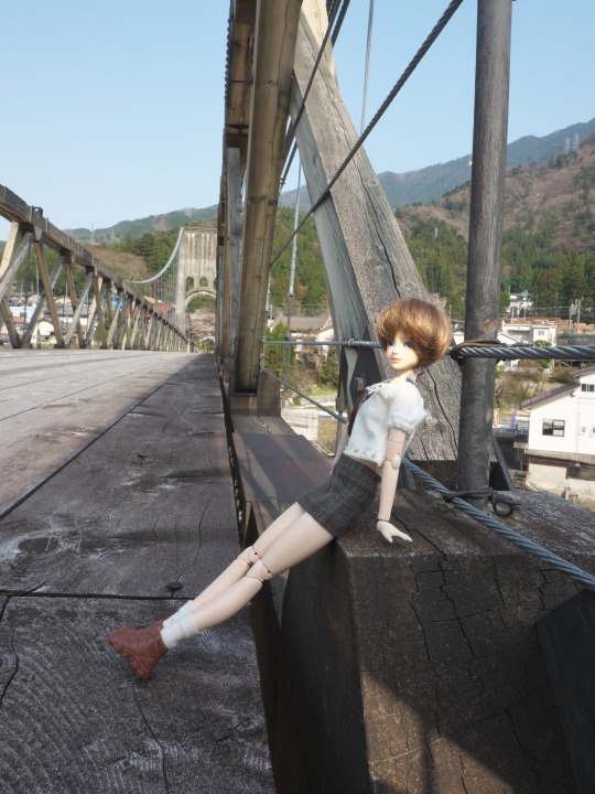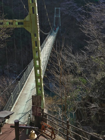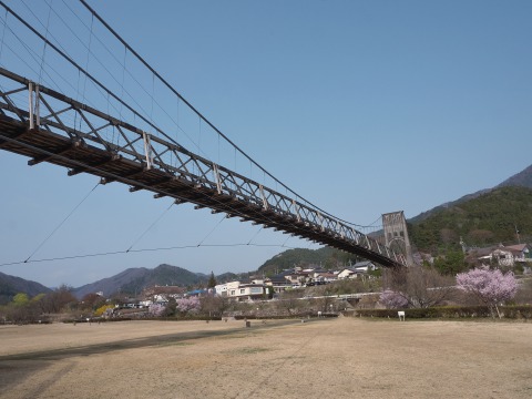 一見、近代的なつり橋のように見えるのですが、近寄ってみると橋脚に一部コンクリートは使われているものの、基本的にはほとんど木でできて
