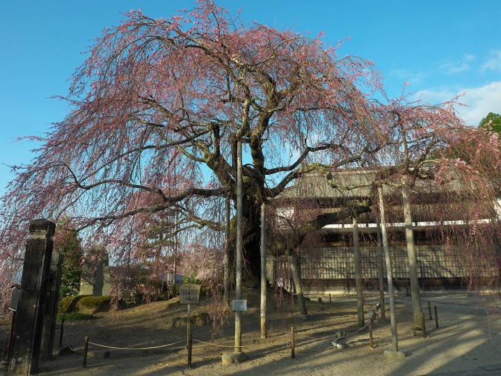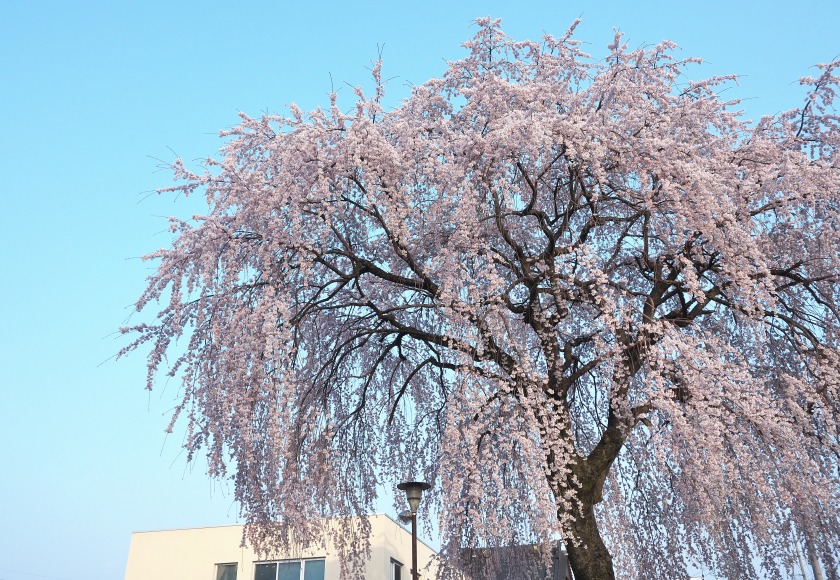 こちらは「舞台桜」と呼ばれるとても大きなシダレザクラ。後ろに写っているのは旧座光寺麻績学校校舎。