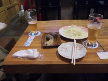 夕食です。先ほど通りかかった蔵造りの居酒屋さんに入りました。おつまみはいろいろあるのですが、基本的に一品300円ときわめてリーズナ