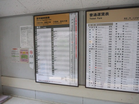 ないんです。(買ったあとで気が付いた) ということで始発となる天竜峡の出発時刻からすると、多分8:40ぐらいということです。
