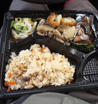 駅前の桜は満開です。ちょっと早いけど、駅舎内でお弁当も売っていたので、こちらでお花見しながらお昼にします。