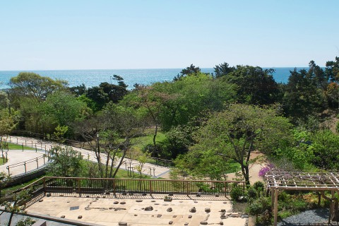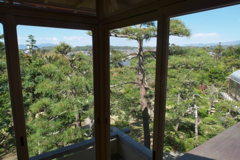 こちらは銀の間、吉田茂の寝室兼書斎だったところです。広い池泉回遊式の日本庭園と相模湾が一望できます。