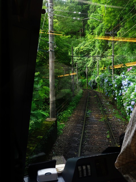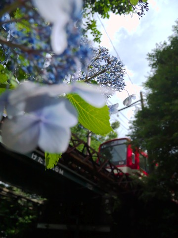 今回の旅のベストショットは多分これでしょう。これできちんと運転手が写っていて、手前のアジサイがもっと青く大きくぼけていたら