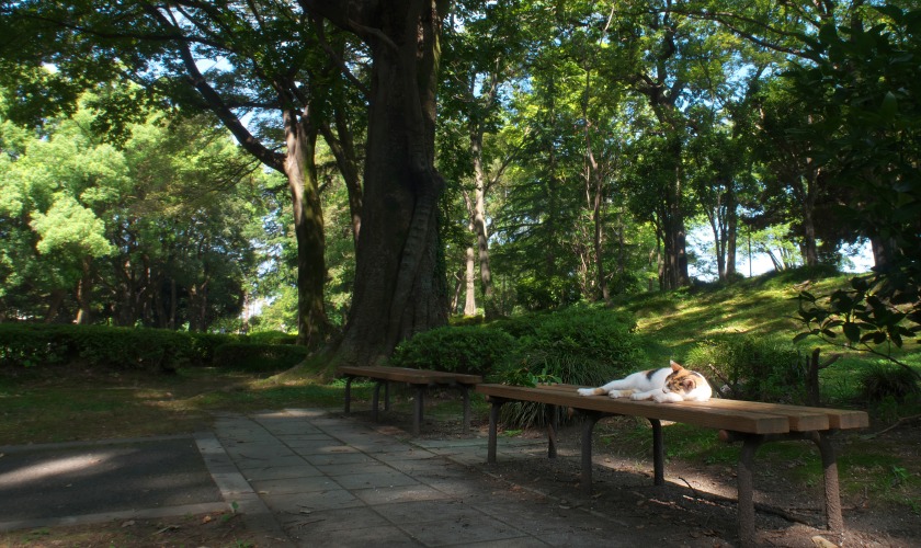 ということで周辺の森で撮影した画像を1枚UPします。涼しい風のそよぐベンチで寝ていたネコが気持ちよさそうでした。本当に今年の夏は暑かったですね。