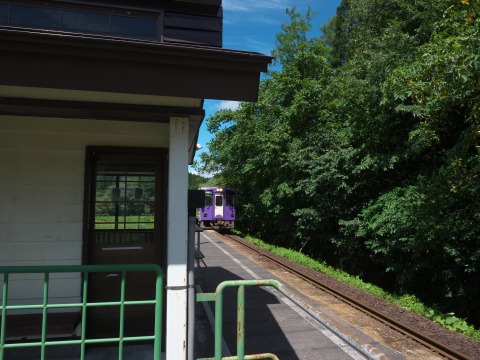 今度の車両は紫。秋田内陸線はカラフルでビビッド。そして速い。