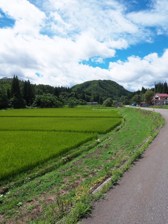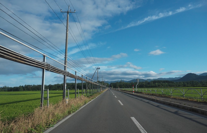 いちめんの田んぼの中のまっすぐな道、そして道の西側には防雪のフェンス、日本海側の穀倉地帯ではよく見る風景です。