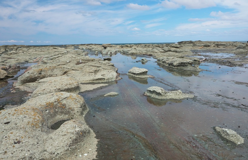 このあたりは地殻変動の激しいところで、海底の何度かの隆起と波の浸食によってこのような地形ができたんだそうです。延々と磯だまりのある風景が続きます。