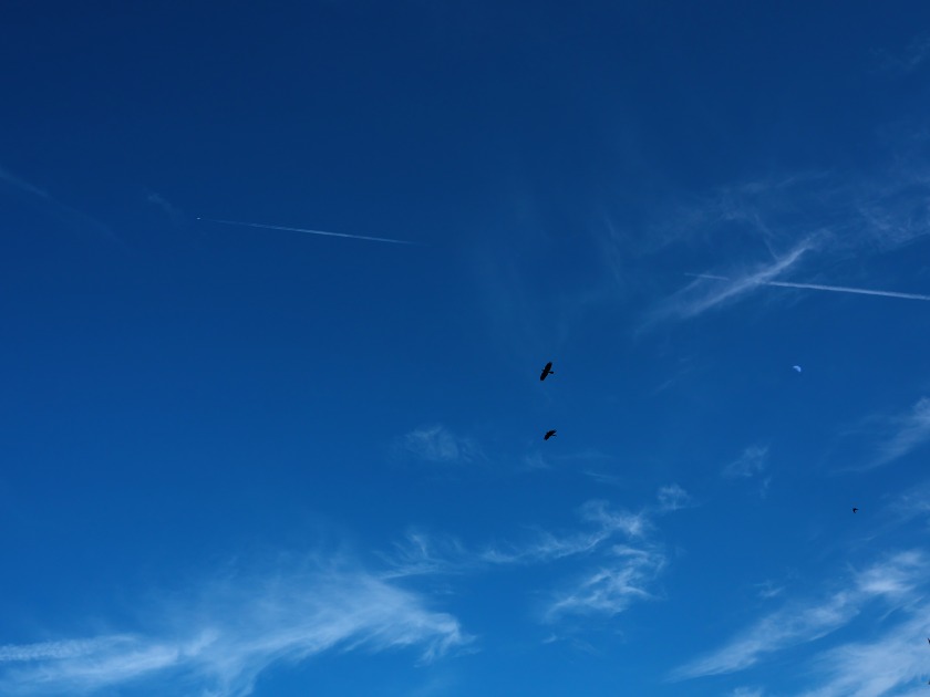 千歳に向かう飛行機と鳥、そして月。