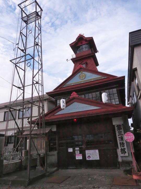 こちらは消防団の建物です。建物もすごいけど、なかに入っている消防車もレトロで必見。