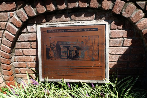 朝日中学校の壁には旧河合映画撮影所跡(改組・合併を経て現在は大映)のパネルが埋め込まれています。