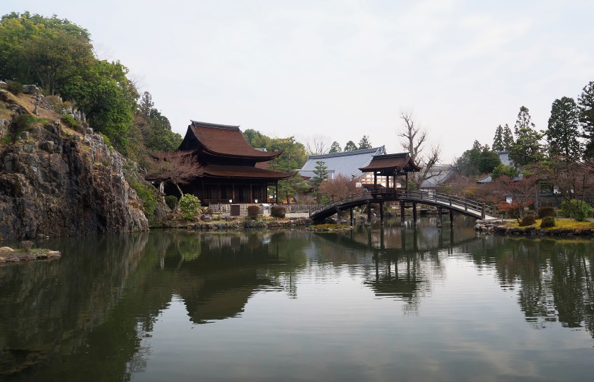 正面が国宝に指定されている観音堂。池にかかる橋は無際橋。