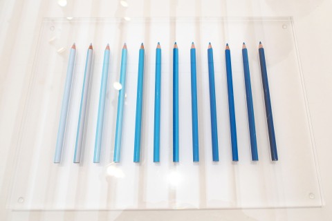 白い上の真ん中に2色の色鉛筆の線が引かれているというシンプルな作品。作者は2色の芯の入った色鉛筆自体を制作