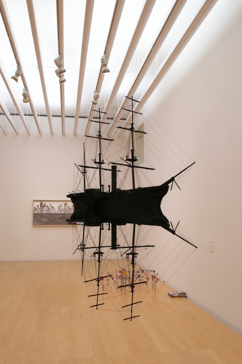 水平線を境目にして上下対象につくられた帆船。インパクトあるな・・・。(岩崎貴宏氏の作品)