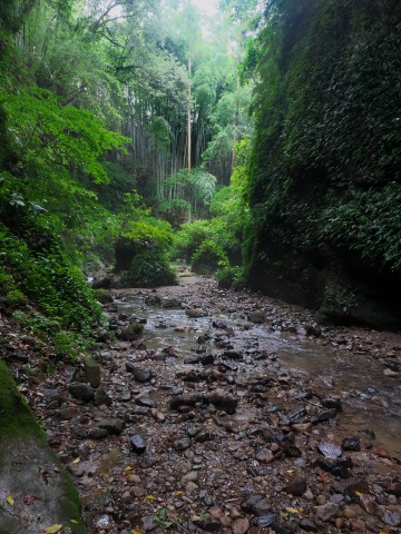 海蝕によってつくられた穴の向こうに、更に渓谷が続いています。実に神秘的な空間なのですが、さすがに雨の降る中の渓谷散策は厳しい。