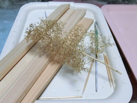 材料としてはヒノキ材、5mm厚のスチレンボード、2mm厚のスチレンペーパーを主な材料として、オランダドライフラワーで、