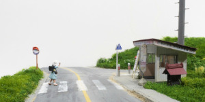 実在する「山入口」バス停の風景を再現しています。もしかしたら、夏の朝、こんなシーンがあるかもしれない。