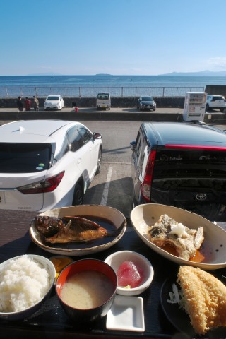 どれも大き目の魚料理が3品以上ついている。お魚だけでお腹いっぱい。こうやって正面に初島を眺めながらの昼食は画になります。