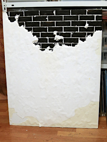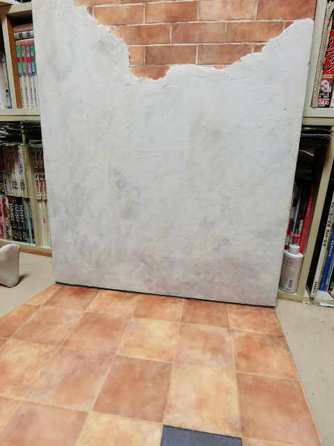 がしかしここで作業が中断、どういうことかというとレンガの表現に用いたフロア材ですが、表面がビニルコーティング