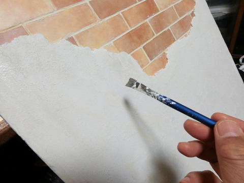 5 あらためてこのレンガの上に粘土をのせてゆきます。モデリングペーストの処理も同じ。