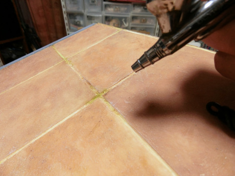 13 ドライブラシしたあと、エアーブラシで目地部分にロシアングリーンを吹き付けます。