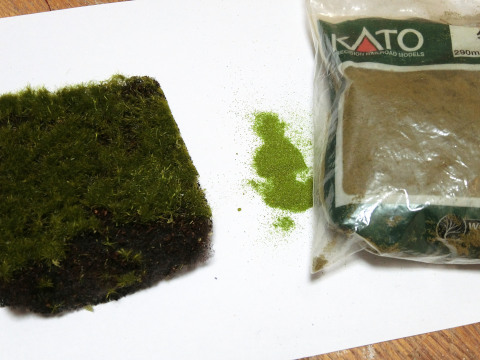 使うのはこちら、左から100均で買ったジオラマシート、緑のパウダー、KATOのターフといったところです。