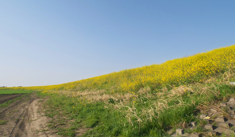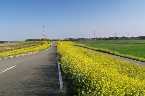 最初の黄色い丘は埼玉県の川島町を流れる荒川の土手です。延々と数kmにわたって菜の花に覆われた土手が続きます。