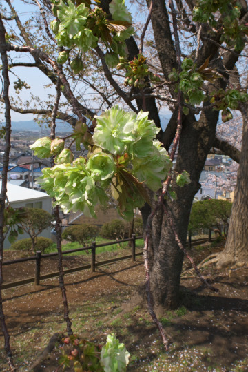 その公園内にある花が緑色の変わった桜、ウコンザクラというそうです。緑なので近づかないと気づかない。