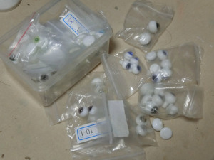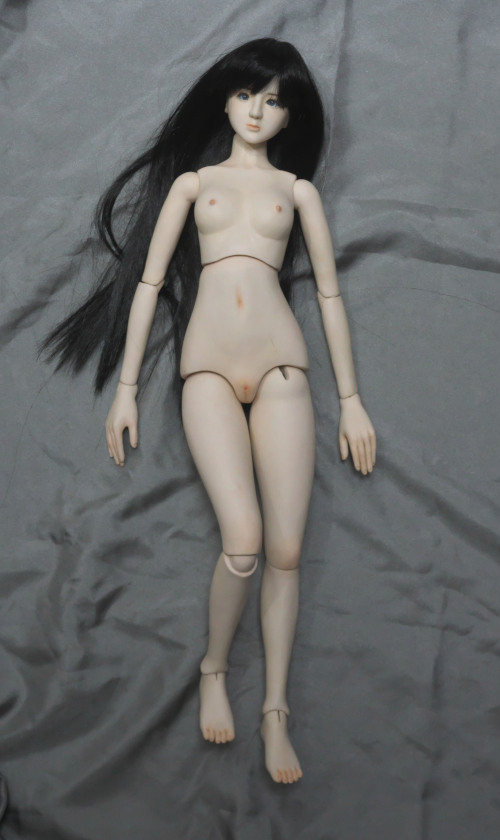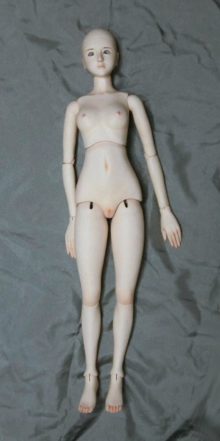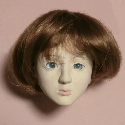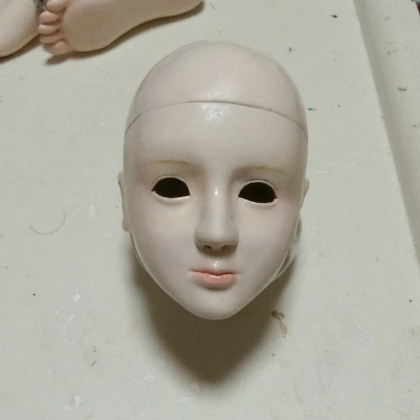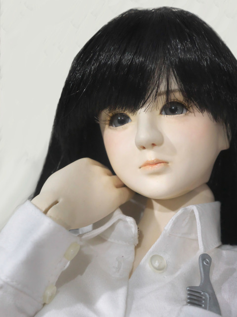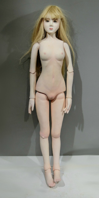 下地塗料はモデリングペーストにリキテックスのアンブリーチドチタニウムとライトポートレートピンクを混ぜて肌色に調整したものです。分量比は目分量で 96:3:1 ぐらいかな? ちょうどMr.カラーのキャラクターフレッシュ No. 111 と同じ色調に整えています。こうすると後でちょっと補修するときにも困らないで済みます。 だいたい3回ぐらいこの下地塗料を塗ったら布ヤスリで磨きます。この下地塗料はしっかりと磨けるというのが最大のメリットです。3回の塗りと磨きを全体が平坦に なるまで繰り返す。話としては簡単ですが、この工程がけっこうしんどいし飽きる。創作というより単純作業の繰り返し、でもここが仕上げの一番のポイントで手は 抜けません。だいたいこの工程だけで2週間ぐらいかかる。 この下地塗料は厚みが出るので、爪とか指関節などの工作は下地作りの最後の段階で行います。この下地塗料はデザインナイフで切削が可能というのが有難い。 並行してヘッド部分の造形にも取り組んでいます。 14 ヘッドの頭頂とフェイス部分の段差をなくします。そして違和感のあった 上瞼と顎、鼻の形を整えました。 ![]() 実は作業に入る前の3日ぐらい、ときおりじっとこのヘッドを眺めて考えていました。人形作りって指先の器用さってのもあるけど、それより大切なのは観察力だと 思っています。 リメイクプラン D CG適当なウイッグとアイを入れて撮影し、それをPC上で画像処理してこの先の修正点を見つけます。 ![]() 作業っていうのは進めば進むほど選択肢が少なくなってゆくものなので、初期段階での構想とかイメージってとても大切です。 上の画像をもとにして、軽く鉛筆で入れた眉毛の向きを変えてみました。向かって右目をやや大きく、左目はやや垂れた感じに修正しています。これは実際に 作業しているのではなく、GIMPを使ってPC上でシミュレーションしています。 そのあとのイメージとして軽くメイクも入れてみた・・・。大丈夫そうです。 こういう感じで自分は作業をすすめてゆくので、カメラとPCは必需品です。だから突如PCが動かなくなると作業そのものがストップしかねない。 15 シミュレーションに従ってヘッド部分の造形を行います。 ![]() 確認されたイメージに沿って作業をすすめます。更に下地塗料を塗り、布やすり(180番)で全体を磨く。こまかな作業は主にデザインナイフ、あとは時々リューターです。 この下地塗料が良いところは基本的な着色ができる上に磨きや削りが入れられるところです。この塗料も必需品。 上の画像は最初に思いついた修正点に手を加えたところです。そして実際には、更にここで再び撮影してPCに取り込みシミュレーションする。あとはその繰り返しになります。 よくもこれだけ手間のかかることをやっているなと、自分でもときどき思うことがある。 下地が出来上がったら本塗装とボディメイク、コーティングの工程になります。この先けっこう工程数があるのですが、ほんの少しずつしか変化しないのでテキスト中心で 整理してゆきます。 16 Mr.カラーのNo.111キャラクターフレッシュと同じ色合いに調合したリキテックスを全体に塗りあげる。 17 これにブラウンを混ぜたものを陰になる部分に塗り、パール粉を混ぜたものを明るい部分に塗り分ける。 といっても、見てわかるぐらいにしちゃうとおかしいので、ブラウンもパール紛も混ぜる量はほんの僅かです。これで立体感のようなものを出します。 ![]() 18 乾いたところで全体にアサヒペンの高耐久スプレーつや消しクリアーを吹き付けます。(上の画像) 19 球体関節部分にMr.カラーのクリアーレッド+オレンジを吹き付けて赤みをつけます。 20 関節部分だけに高耐久スプレーを塗り重ねて、関節が適度な遊びとなったところで関節部分の塗装は完了です。 関節部分にこれ以上吹き付けると、関節が動かなくなっちゃう! お分かりかと思いますが高耐久スプレーは透明な保護層をつくるために使っています。ちなみにつや消しクリアーというネーミングですが、実際には半つや消しぐらいで、 けっこうぴかぴかしてます。 ![]() 21 Mr.カラーのクリアーブルーをできる限り薄くして、わざとムラになるように(第二次世界大戦中のドイツ軍の夜間戦闘機迷彩みたいな感じ・・・と言っても分かるかな?) 吹き付けます。 人間の肌は基本的には彩度の低いオレンジからピンクの色合いです。この補色となるブルーを最初に塗ると、色合いが複雑になって厚みのようなものが出てきます。 絵画の世界では昔からある技法です。ちょうど静脈の流れのようなものが表現できたりもします。 22 高耐久スプレーを再び吹き付けます。 23 今度はMr.カラーのクリアーレッド+オレンジを唇やその他赤みをおびた部分に吹き付けます。またわざとムラになるように吹き付けて動脈のような表現をつけます。 ![]() 24 高耐久スプレーを何度となく吹き付ける。今回は多分10回ぐらい、スプレーが2本空になりました。(上の画像) こうい