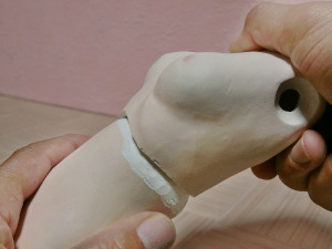 パーツにテンションゴムを通す作業の始まりはパーツを並べてどの位置にゴムを通すか鉛筆で印をつけているところからスタートです。基本は「頭頂部からかかと までまっすぐゴムを通す」「指先から反対側の指先までまっすぐゴムを通す」です。 その印をもとに穴を開ける部分を決めてゆきます。穴の開け方はつくる人によってかなり違いがあるみたいですが、自分の場合には動きを制約しない範囲で極力 小さく開けることにしています。こうすると関節がずれにくくなり、ポーズが決まりやすくなります。 また穴を小さくするためには使用するゴムはできるだけ細いものが良いわけで、そのためには人形自体をできるだけ軽くする必要があります。だから自分は軽量な 粘土をできるだけ薄くして使います。 現在はラドールプレミックスとプルミエを半々に混ぜたもの、厚みはだいたい2mmから3mmといったところです。重さは最新作で400g強、持つとあまりの軽さに皆 驚くほど。 また全体を軽量化することでゴムのテンションは小さくすることが可能で、関節の摩耗を少なくするメリットもあります。 こういったことがすべて連動するということが分かってきたことも、これまでの成果の一つかな。 ![]() つなぎ直して、関節の可動範囲を確認しているところです。 10 ゴムを通す穴は小さめに開けてあるので、動きを制約して いる場合にはこの穴を拡大します。 ![]() 立つ座る、その他もろもろのポーズをとらせて関節を調整してゆきます。 リメイクプラン C 関節が成型できたので、いよいよ造形作業に入ります。 まずは全体を眺めておおまかな方向性のようなものを考えてゆきます。ただ長い時間かけたこともあって、今見てもそこそこうまくまとまっている 感じはするね。 ![]() 一方でSD(スーパードルフィー)が全盛だった時代につくったものなので、それに引きずられているようなところも感じるな。 ここはいわゆるフィールドライン理論に基づいてちょっと女性らしい丸みがあって、スムースなボディラインを描くように変えてゆきたいと思います。 「見た感じが柔らかいということ」、最近のテーマはそれです。 11 プランに沿って盛るところは盛る、削るところは 削る。そして磨く。 ![]() まずはイメージしたラインを直接ボディに書き込んでゆきます。「+2」は最大で2mmぐらい粘土を盛る、「-1」は1mmぐらい削るという意味です。 いちばん大きい変更はやはり関節周辺です。膝、足首、手首などは一回り細く修正します。関節が太めなのは分かっていたけど、強度不足になるのではないかと不安で できなかった。でも今の自分の技量だったらたぶん大丈夫。 次に粘土を盛ったり削ったりの作業になりますが、注意事項としては、塗料が塗ってある場所は粘土がそのままでは付かないので、今回はモデリングペーストに少量の 木工ボンドを加え、水で柔らかくしたものを事前に塗って乾かしておきます。 (いつもはジェッソなのですが、買い置きしてあったはずのジェッソがなぜか見当たらなくなっていた。) あとご覧の通り、最初の造形は組みあがった状態で行います。こうすれば関節が曲げたりひねったりして、具合を見ながら造形をすすめることができます。 自分のようにまずは関節をつくる方法であれば、関節を曲げたときのラインを確認しながら作業がすすめられます。これがこの方法の最大のメリットです。