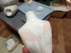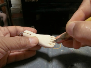 最初の頃は球体関節人形って、早い話が「フィギュアに関節つけて動くようにすればいいんだろ」ぐらいに思っていたので、関節自体もわりあい適当につくっていた。 もちろん適当につくると、きちんと立たなかったり、ポーズが固定できなかったりで、「なんだプロポーションについては、やっぱり固定式フィギュアの方が上じゃん」 てことになる。もちろんそういう面は確かにあるのだけれど、球体関節人形としての美とか機能性の高さみないなものも失われてしまいます。 関節づくりには発泡スチロール球を使う方法が一般的のようですが、自分の場合には使いません。どうするかというと、まずはおおまかに球面の凹凸をつくり、2つの パーツをすり合わせて関節をつくります。具体的にはすり合わせると、あたっている部分は光沢が増し、そうでないところは粘土の毛羽立ちがそのまま残るので、その 部分を削ったり盛ったりして、少しずつ修正してゆく。 もちろん発泡スチロール球を使う方法より手間はかかるのだけれど、発泡スチロール球のサイズに関節の大きさが制約されないし、回転楕円体のような特殊な形状を つくることだってできる。 この記事を読んでいる人のなかで、こういった球体関節人形をつくる人がたくさんいるとは思えないけど、もしおられたらチャレンジしてみて下さい。