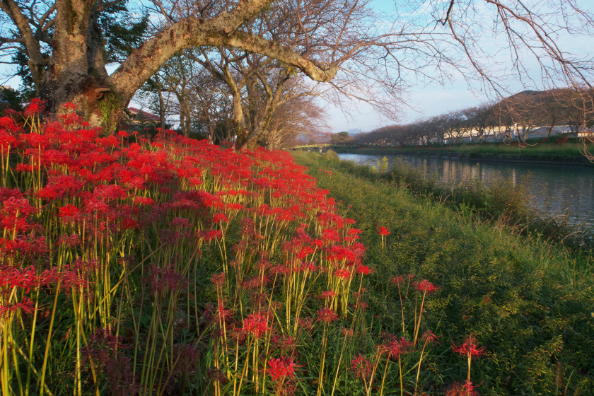 最初の方の画像は大井川の支流の一つで、大津谷川の土手で撮影したものです。朝日が昇り始めると、一斉に彼岸花が輝きだしてすごかった。