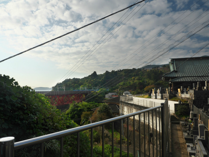 神社から坂を少し下ってゆくと、岩泉寺というお寺があって、目の前がぱっと開ける。鉄橋にJR貨物が通りかかるところだったので、そのタイミング