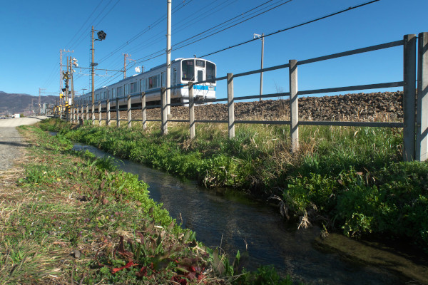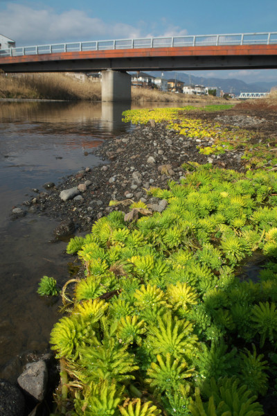 岩原駅のすぐそばを流れる狩川です。遠く富士山や箱根の山々が望めて良いお散歩コースになっている。岸辺に黄色い花が咲いているように
