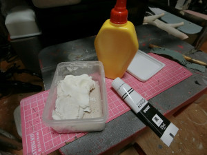 充填剤の材料はドール制作につかう粘土、ここに小動物用の細かな砂を1/5ぐらい混ぜてざらつきを出し、黒のアクリル絵の具を混ぜてコンクリートらしい