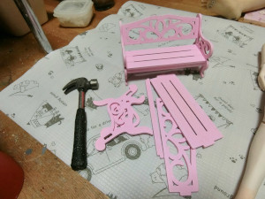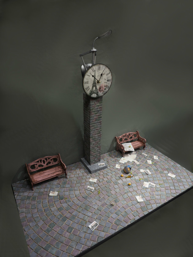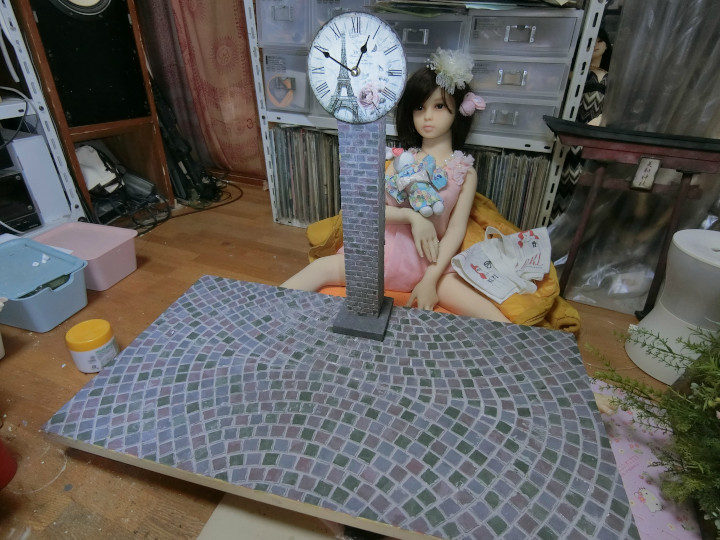 ベースの石畳はスチレンボードを砂などでその質感を出した後に着色したもの。時計塔は市販の時計をベースに自作、ベンチはドール用のものを