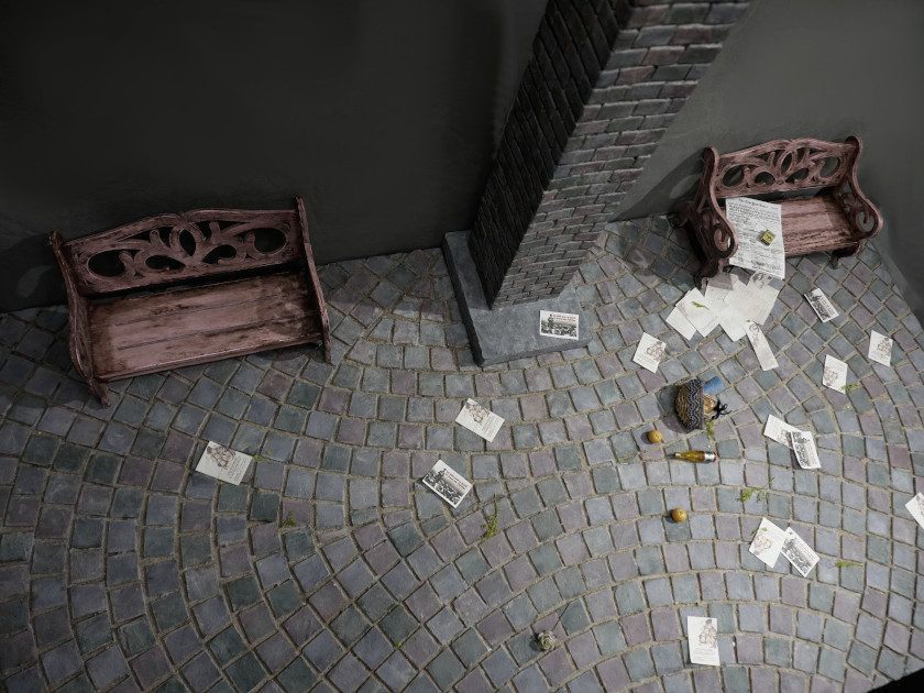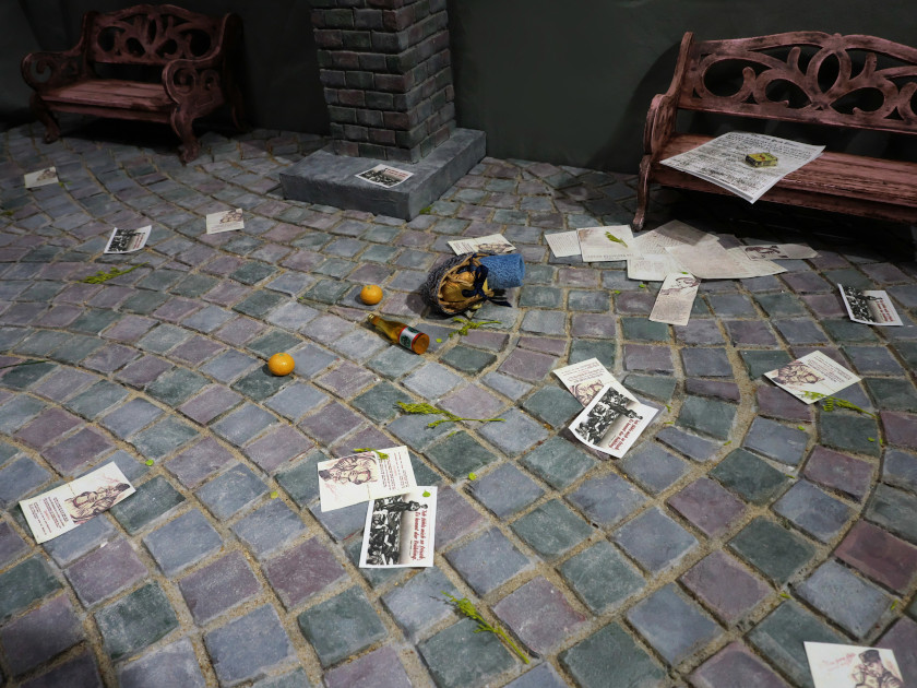 そしてベンチに新聞、歩道に薔薇一輪を置いてみたときに閃いた、この作品はあえてドールなしで完成させる方が良いかもしれない。