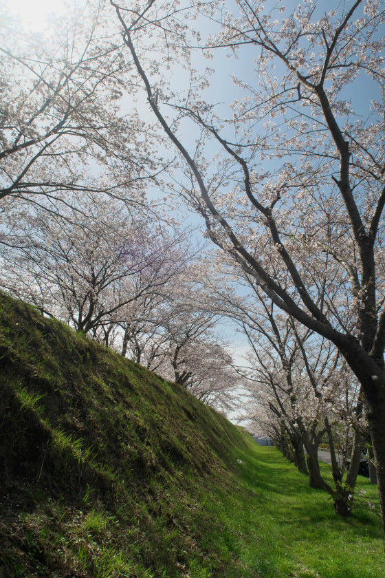 その古墳の上に桜の古木が3本。丘の頂上の更に古墳の上だから、強風の影響で、あちこちで幹が折れている。それでも枯れずにちゃんと咲いているのを見て、ちょっと応援したくなった。
