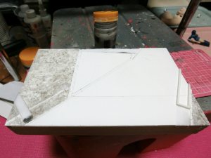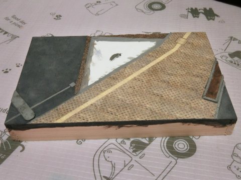 このジオラマは20cm×11.5cmと極小サイズなのですが、ここからきちんと前景や後景をつくって奥行きを出してゆきたいところです。これをやんないと、