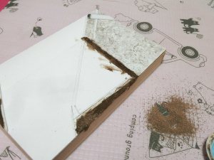 自動販売機らしく見える。更に2mm厚のスチレンペーパーを重ねて販売機の厚みを出し、補強もかねてモデリングペーストを側面に塗る。乾いたら