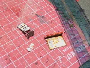 作業はさらに続き、排気口、エアコンのパイプ、アンテナ、ゴミ箱、配電盤、手すり、マット・・・、などを追加する。