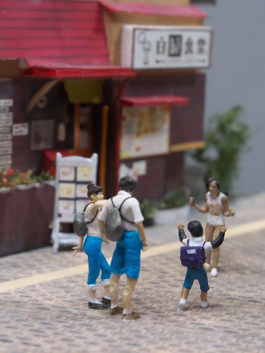 このジオラマは春の休日の朝の風景を再現してみました。弘法山ハイキングコースに向かう家族連れ。