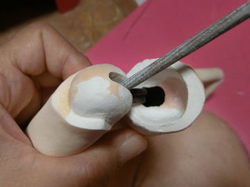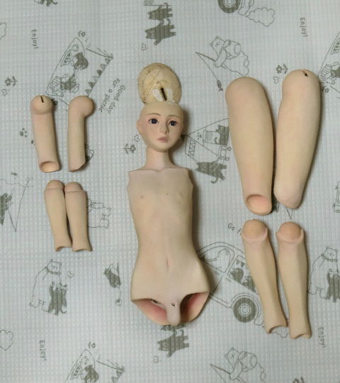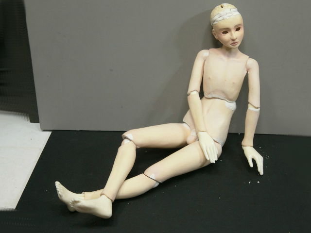 球体関節人形は、まずは固定ポーズの人形を作ってから切断して関節をつくるという方法が主流のようですが、こんな感じで先に関節をつくってから、