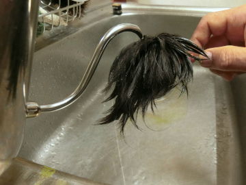 ただ使うポットはコーヒーを入れるときの、口の細いものが良いね。 乾いたら適宜ヘアーをカットします。ウイッグの被さり方で顔の形が変わってしまうので、気に入らな