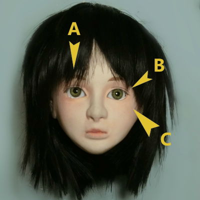 気になる点は3つあります。向かって左側の眉毛がやや薄く、理想のラインよりやや吊り上がっている(A)。右側のグラスアイの視線を少し上に