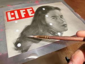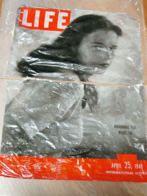 背景はスチレンボードに木目シートを張り付け、そこに1949年に印刷されたLIFE誌の表紙をデコパージュしてつくったものです。