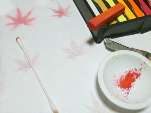 3 裏側は白いままなので、パステルをカッターで削り、その粉を綿棒にとって裏側を着色する。
