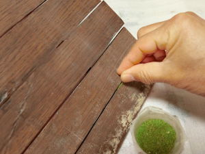 2 そのあと水で薄めた木工ボンドを隙間に塗り、鉄道模型用のパウダーを3種類ぐらいブレンドしてその隙間に落とし込みます。 (上の画像)